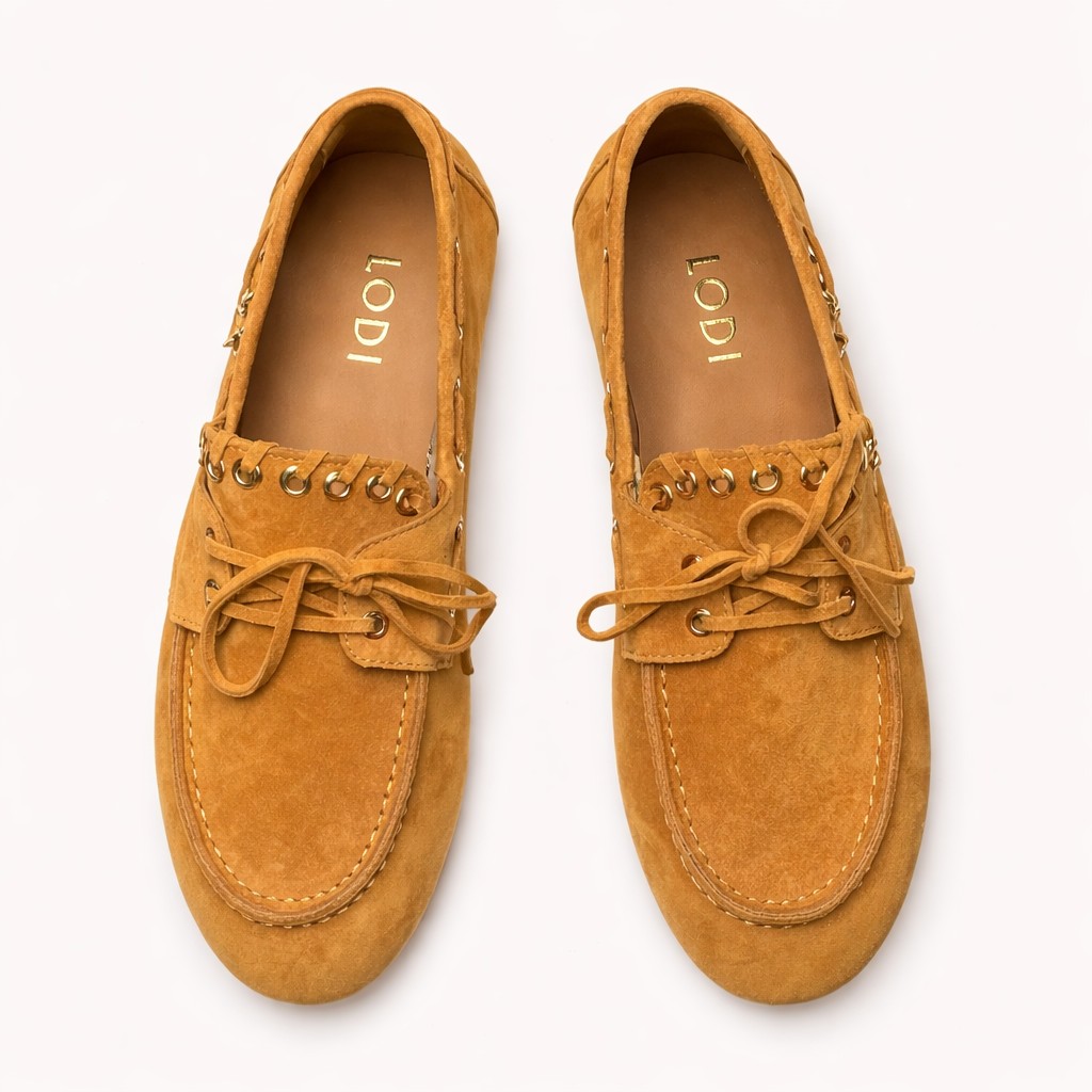 Mocasín de mujer de estilo casual en tono camel, confeccionado en piel serraje de tacto suave. Diseño tipo náutico con cordones finos del mismo material que rodean el empeine y se ajustan con lazada frontal. Detalle de ojales metálicos en acabado dorado que aportan un toque elegante y distintivo.