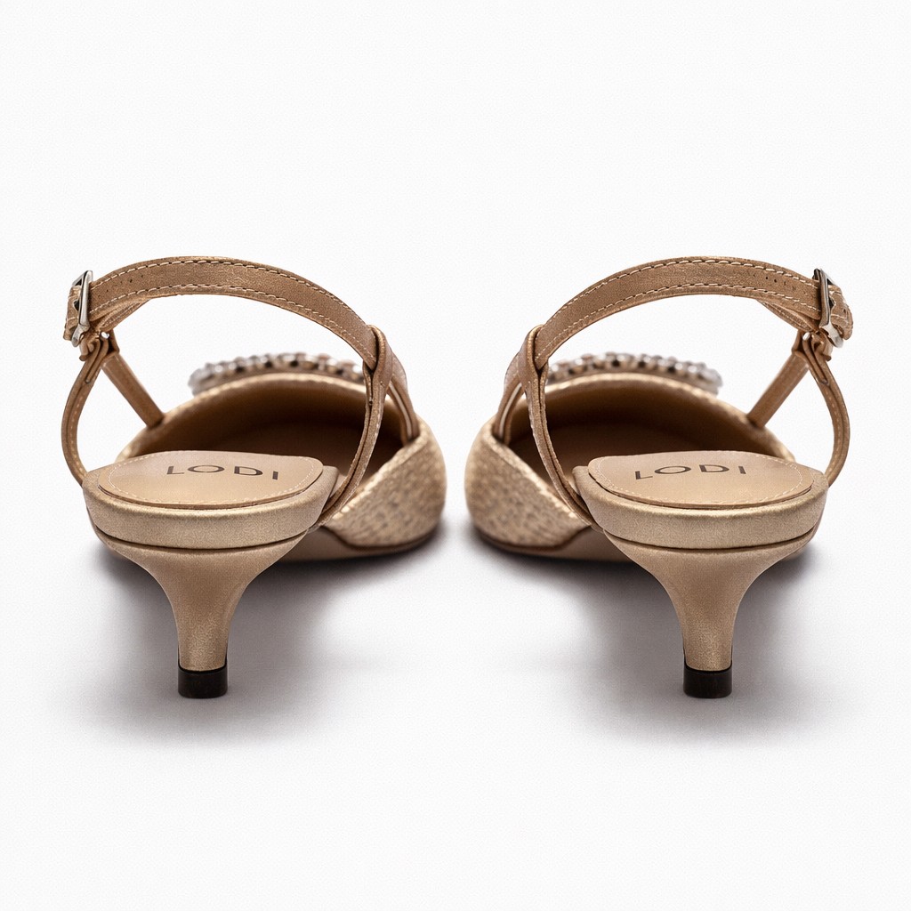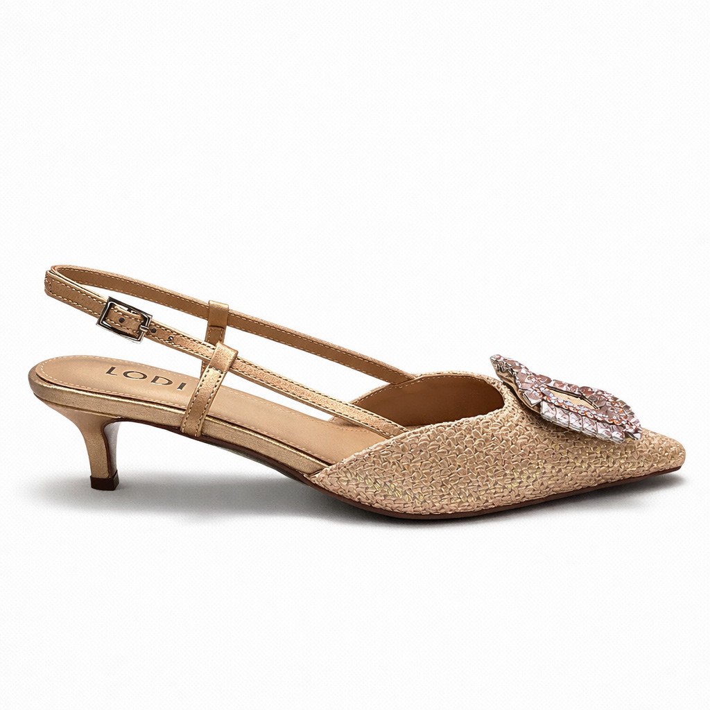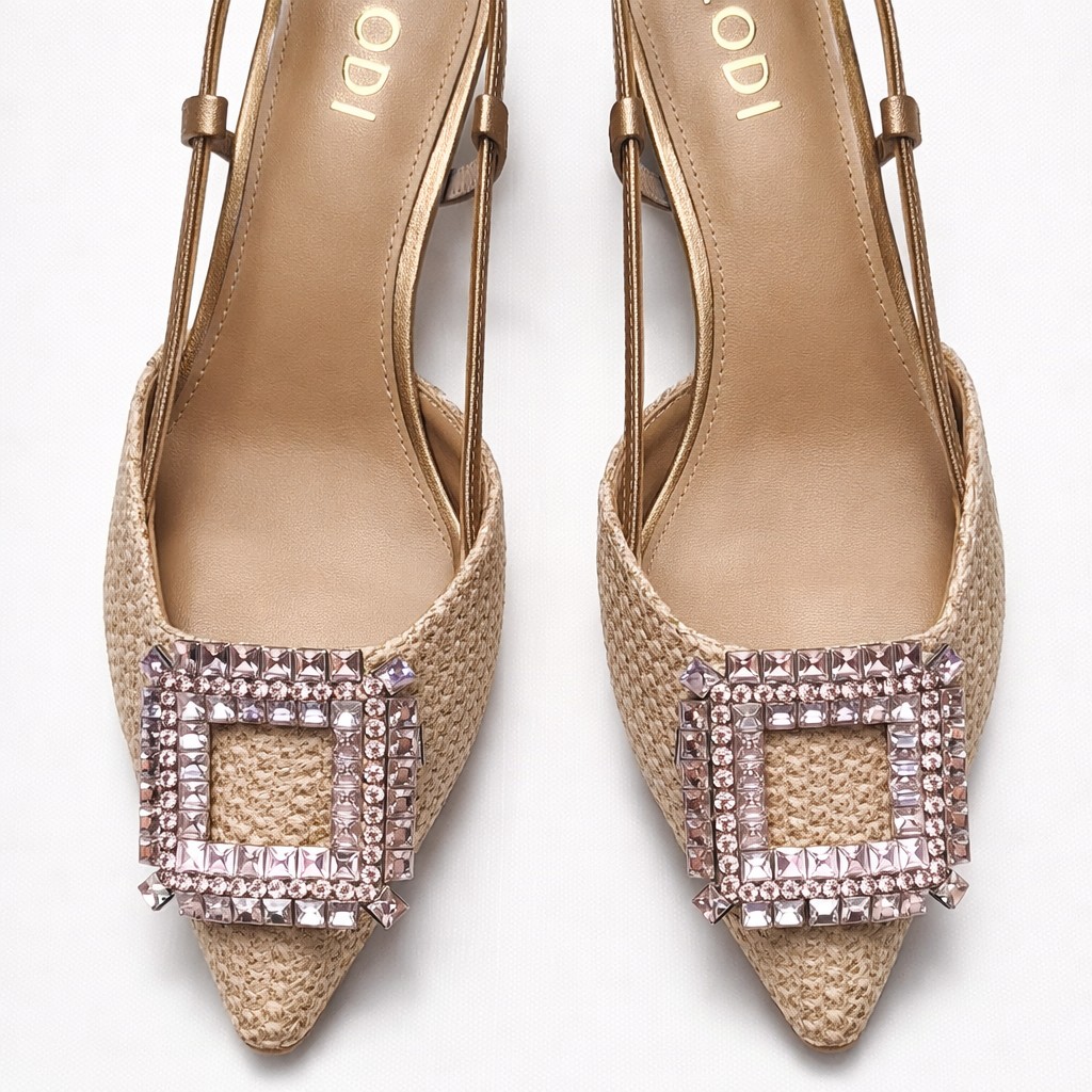 Su puntera afilada estiliza el pie, mientras que el detalle protagonista lo encontramos en la parte frontal: una hebilla joya de gran tamaño con acabado brillante que añade un toque exclusivo y femenino. El diseño slingback con tiras finas y cierre ajustable garantiza una sujeción cómoda y segura.