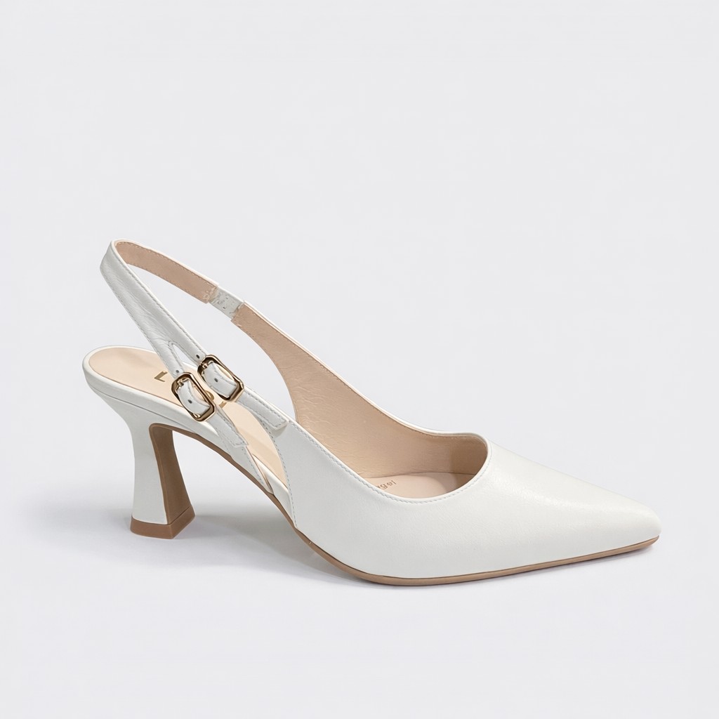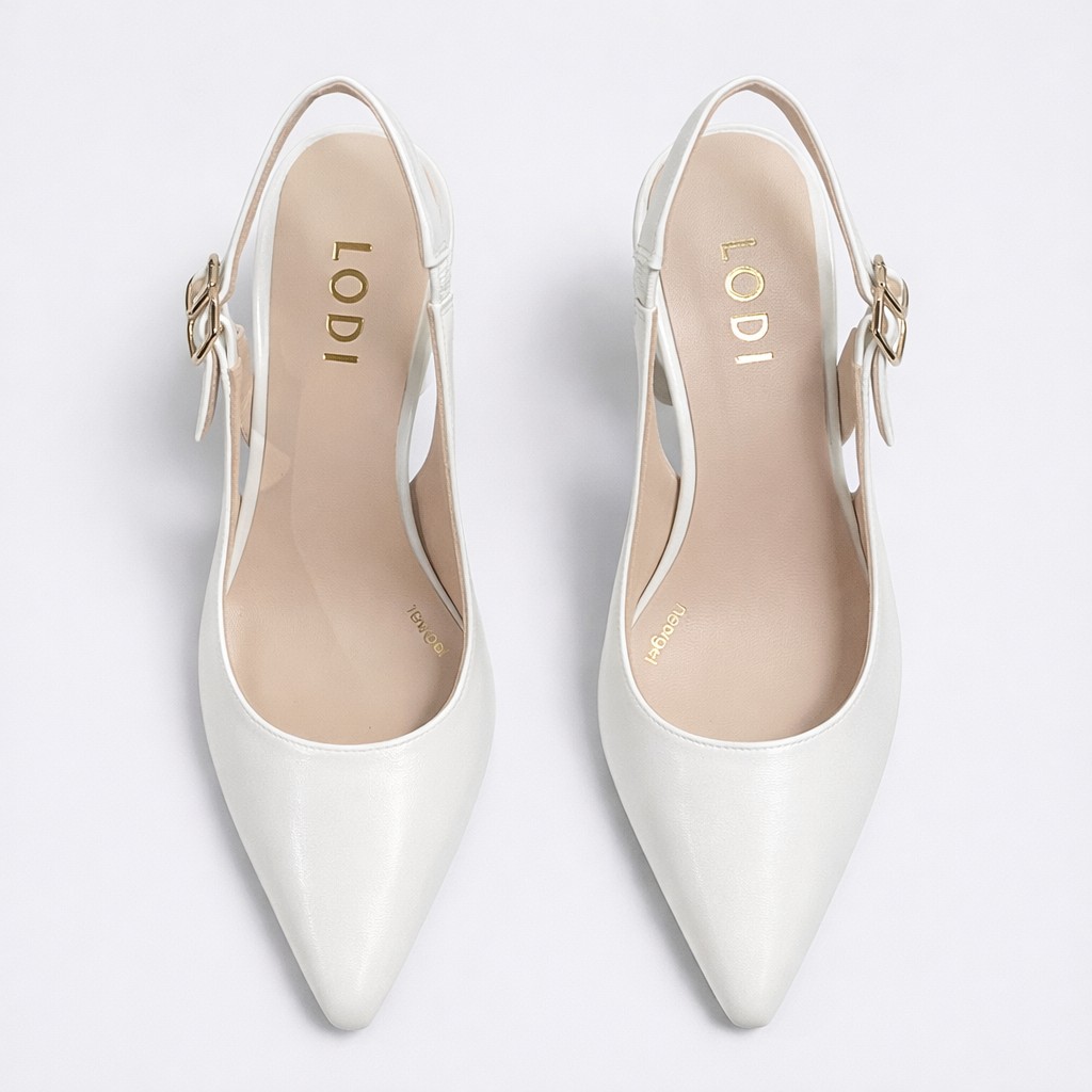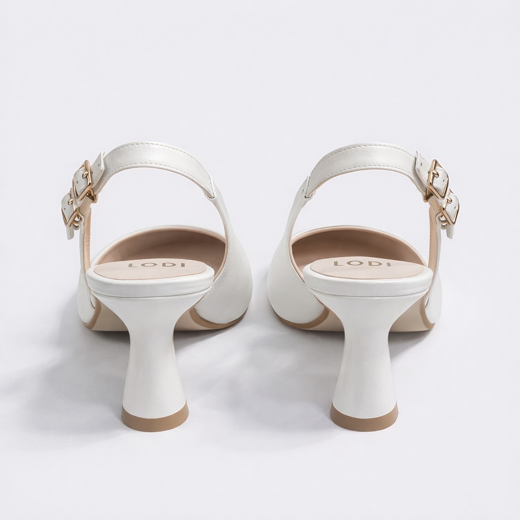 Elegante y sofisticado zapato destalonado de la firma LODI en color blanco, diseñado para realzar cualquier look con un toque refinado y femenino. Confeccionado en material de acabado suave y de alta calidad, destaca por su puntera fina que estiliza el pie y aporta un aire muy chic.
