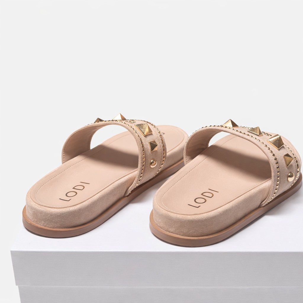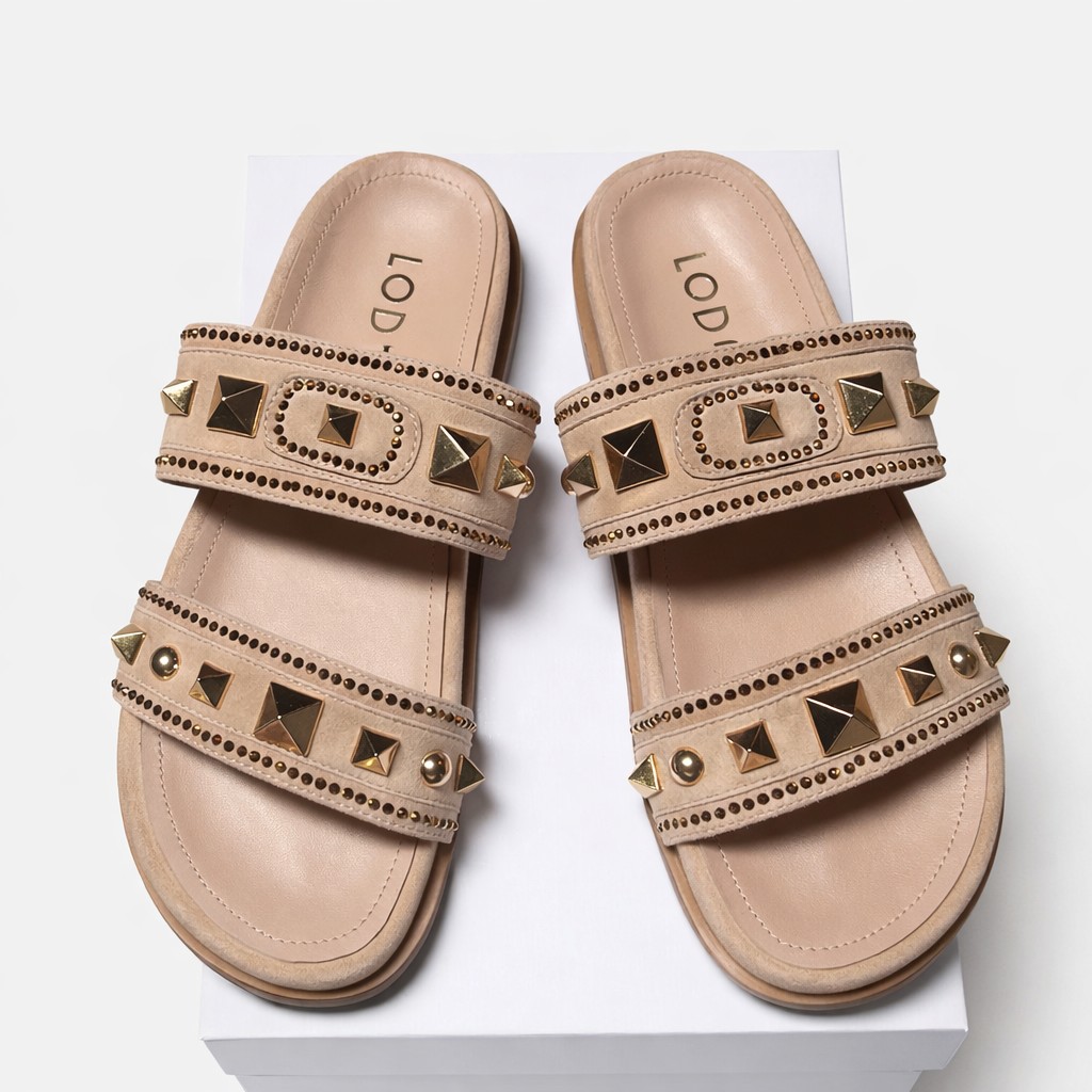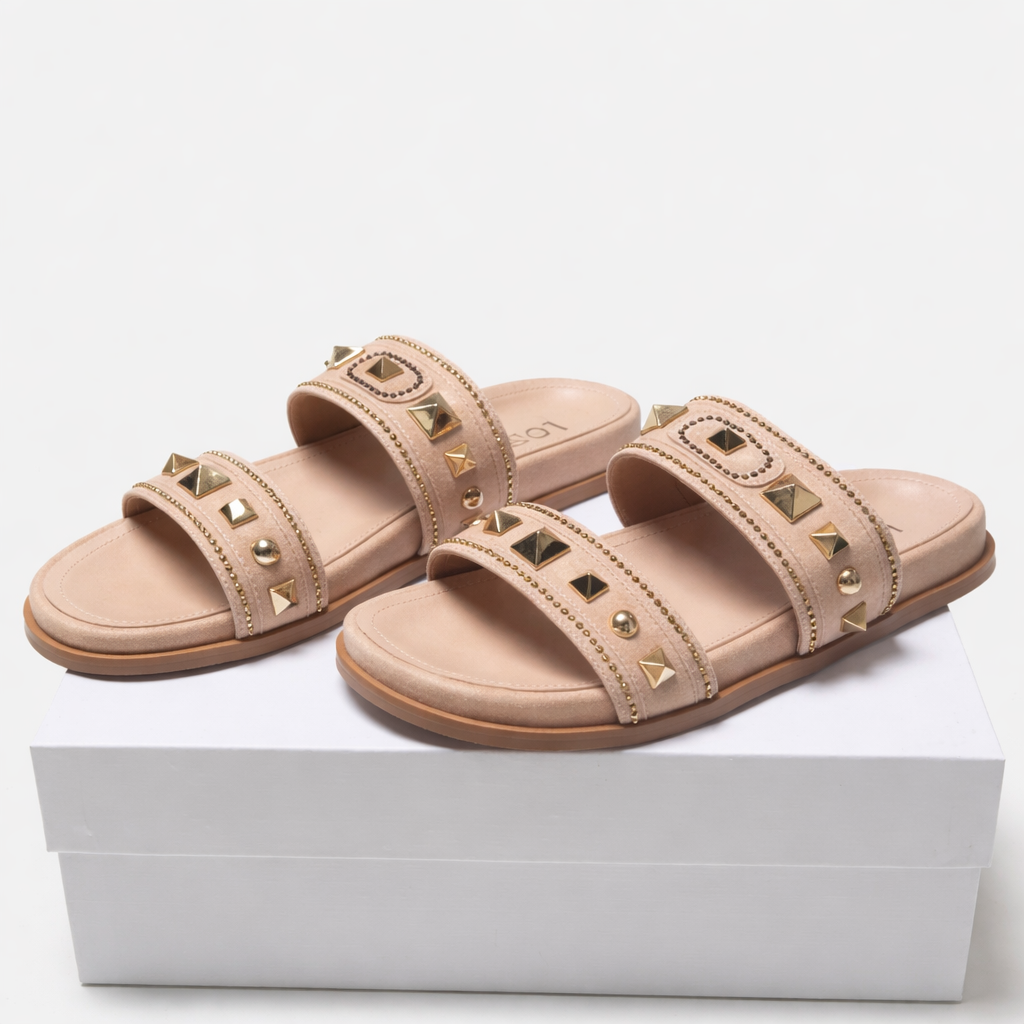 Sandalia plana de estilo sofisticado y actual, perfecta para elevar cualquier look de verano con un toque de personalidad. Diseñada en un elegante tono nude/beige, destaca por sus dos tiras anchas adornadas con aplicaciones metálicas en forma de tachas y pirámides doradas, que aportan un aire moderno y ligeramente rockero sin perder la esencia femenina.