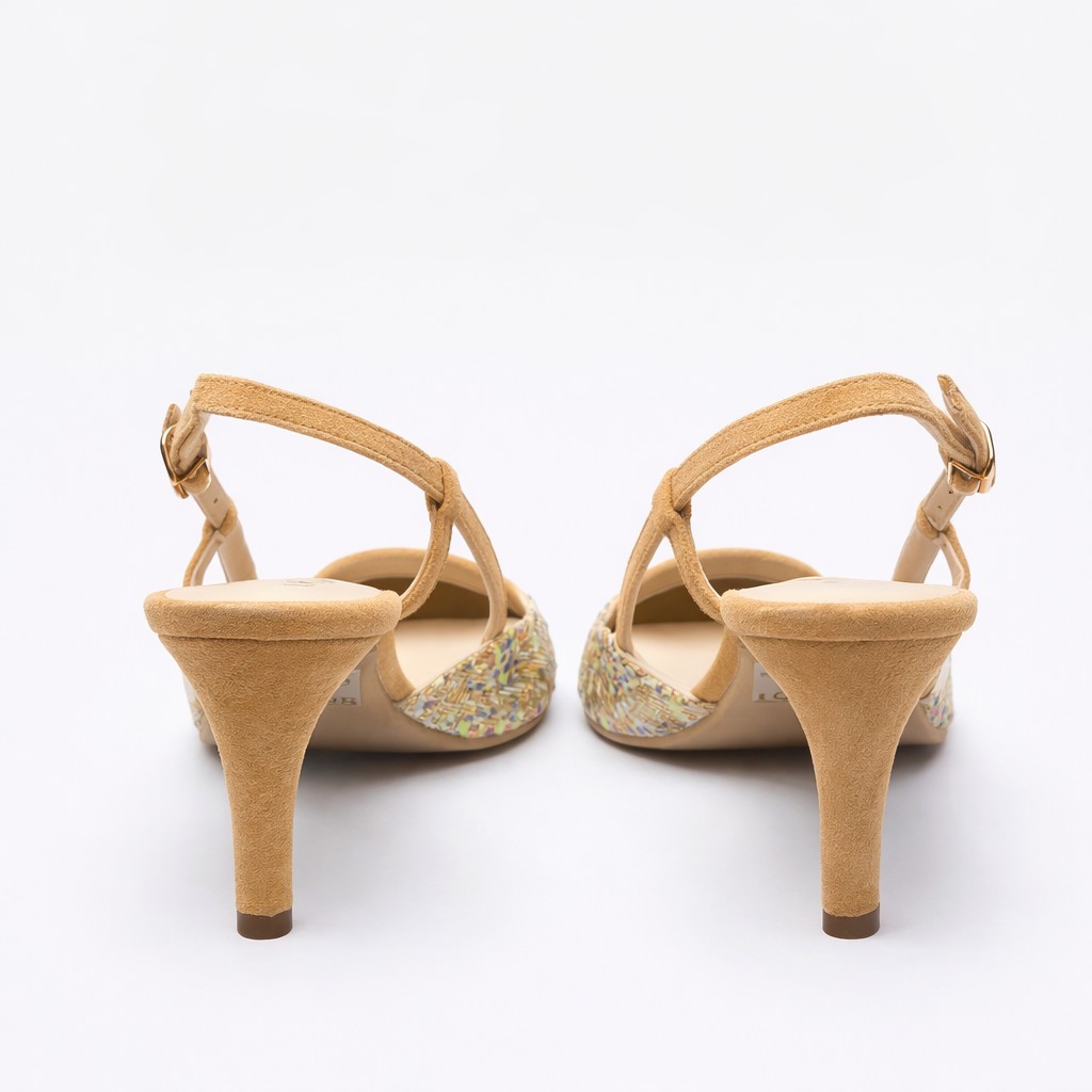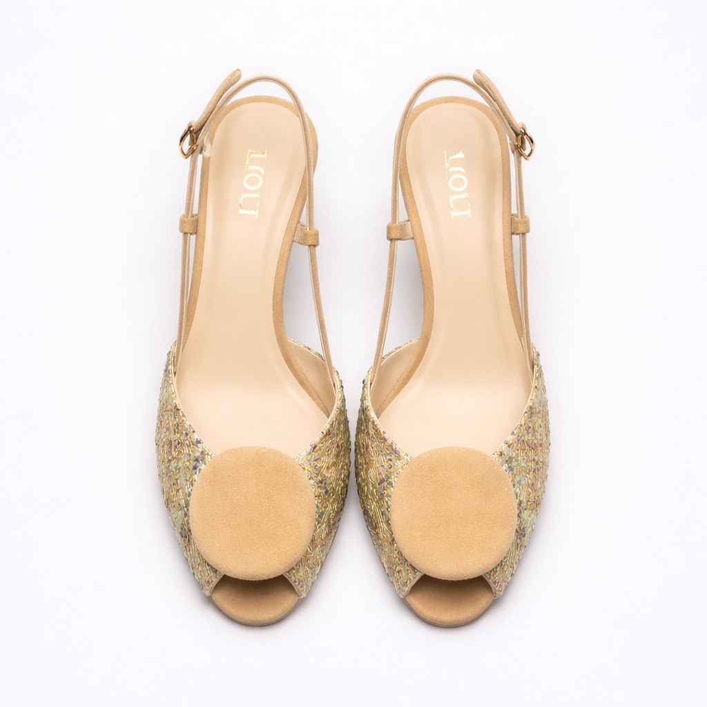 Confeccionado en tono beige cálido, presenta una puntera abierta adornada con un aplique circular en acabado tipo ante que añade un toque distintivo y femenino. La pala destaca por su tejido texturizado multicolor, que aporta luz y dinamismo al conjunto, creando un contraste elegante y muy actual.