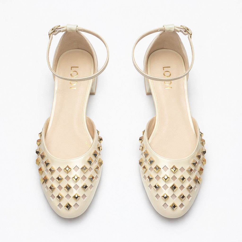 Su puntera cerrada se adorna con aplicaciones metálicas doradas en forma de tachas piramidales, aportando un toque moderno y distintivo que marca la diferencia. La pulsera al tobillo con cierre de hebilla garantiza una sujeción perfecta, estilizando además la silueta del pie.