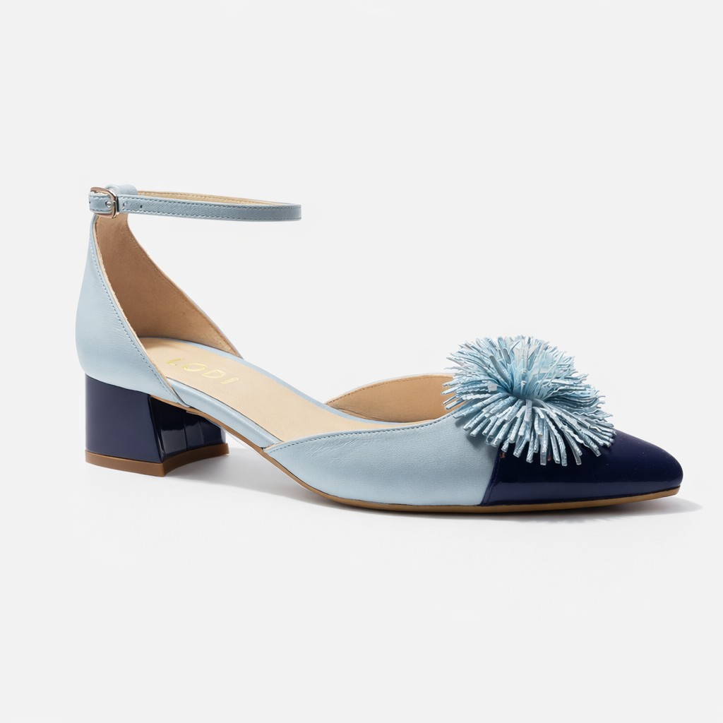 Elegante y original zapato de salón destalonado de la firma LODI, diseñado para aportar un toque sofisticado y diferente a cualquier look. Combina un delicado tono azul pastel en el cuerpo con una puntera en azul marino brillante que aporta contraste y personalidad.