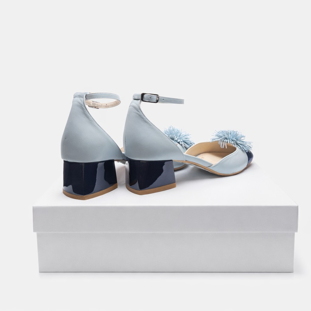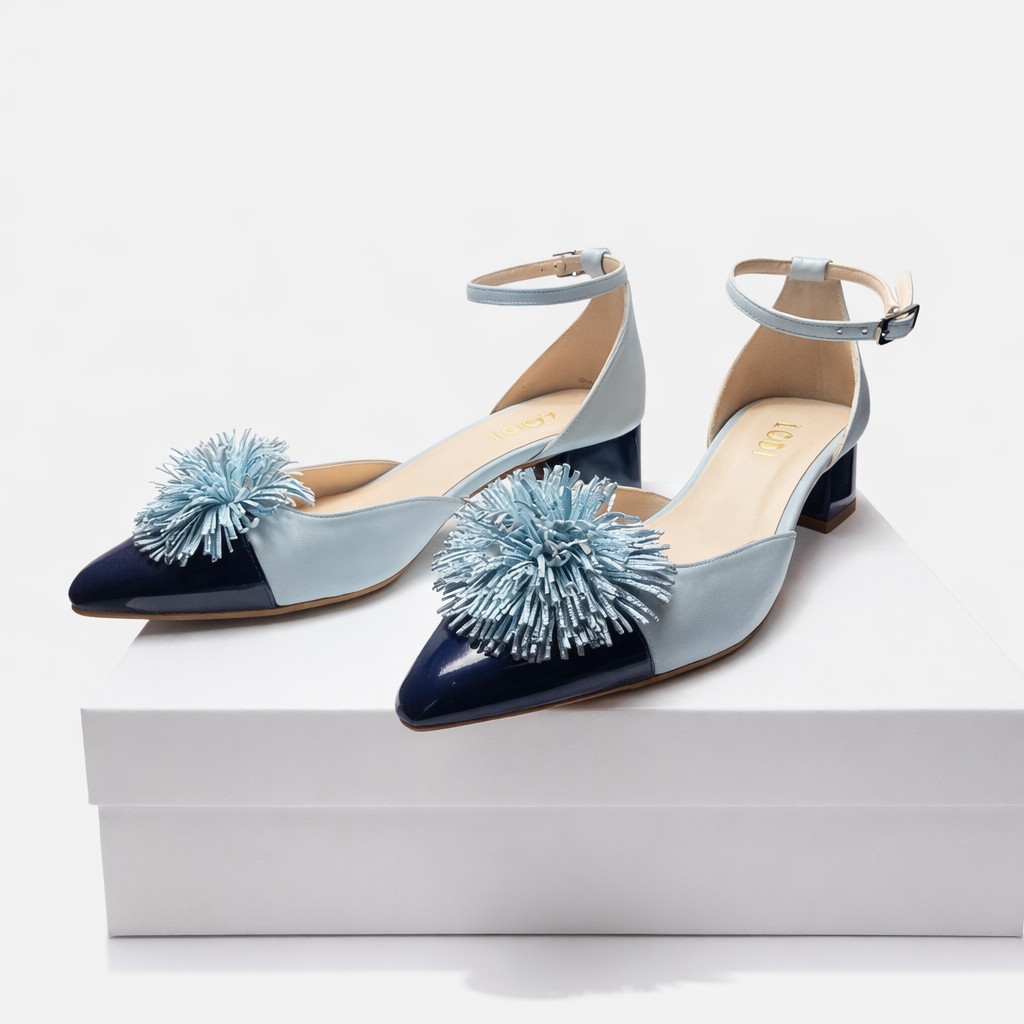 **Zapato salón destalonado LODI en tonos azul pastel y marino con detalle floral**