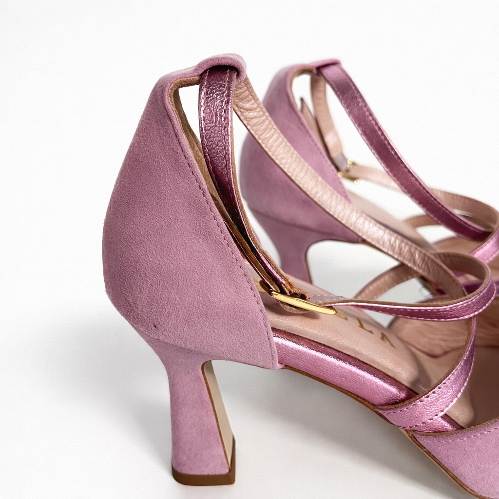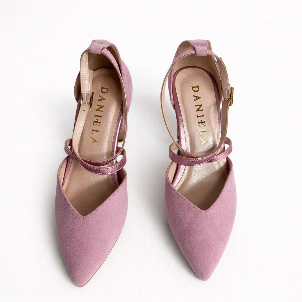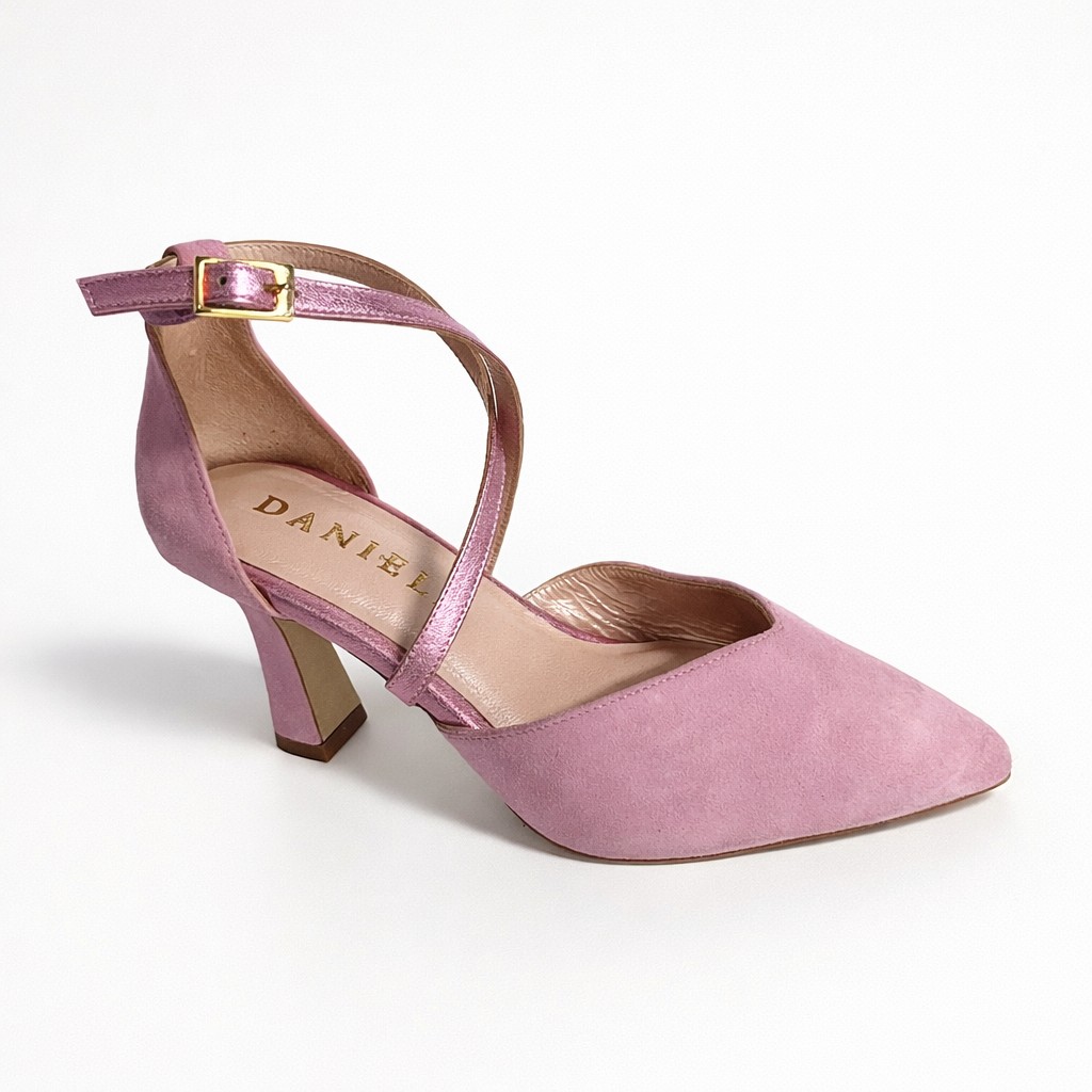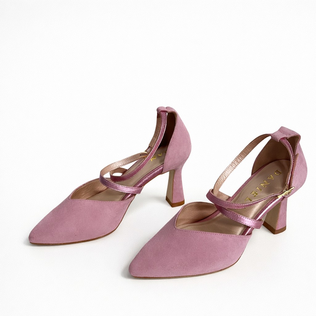 Elegante y femenino, este salón  de Daniela Shoes es una pieza clave de la colección primavera 26. confeccionado en un delicado ante tono rosa empolvado. Combina líneas clásicas con un diseño actual que estiliza el pie y aporta ligereza visual.