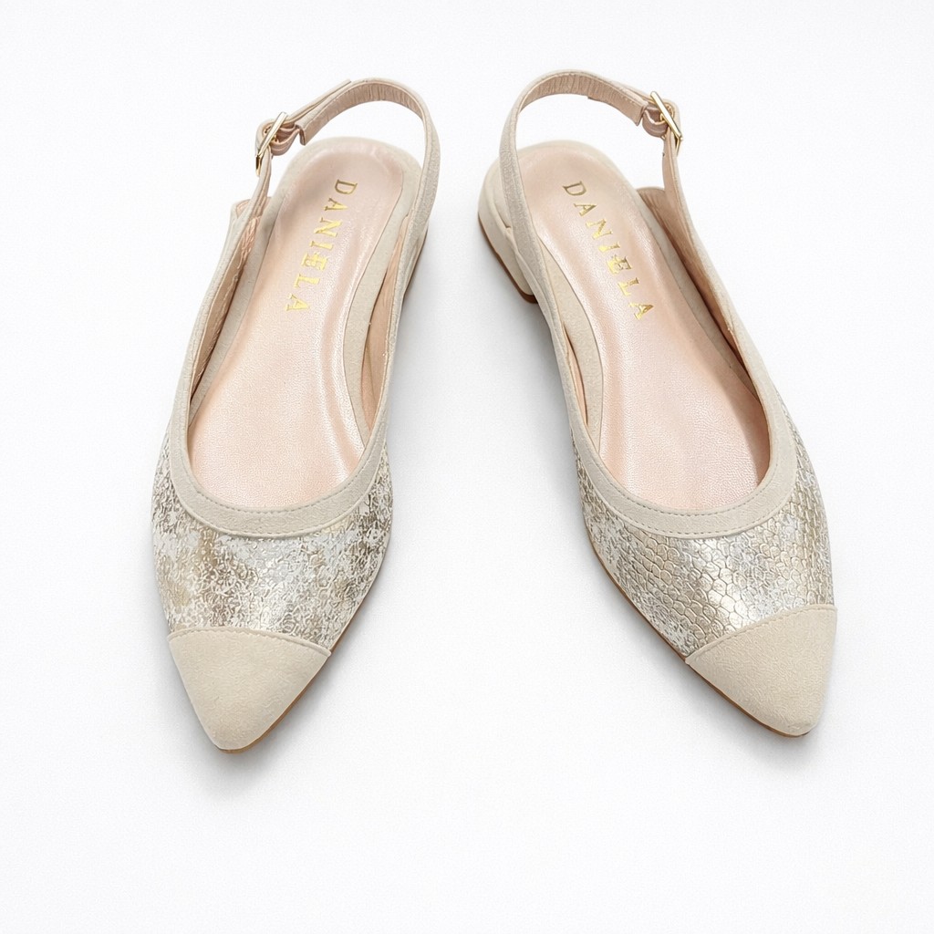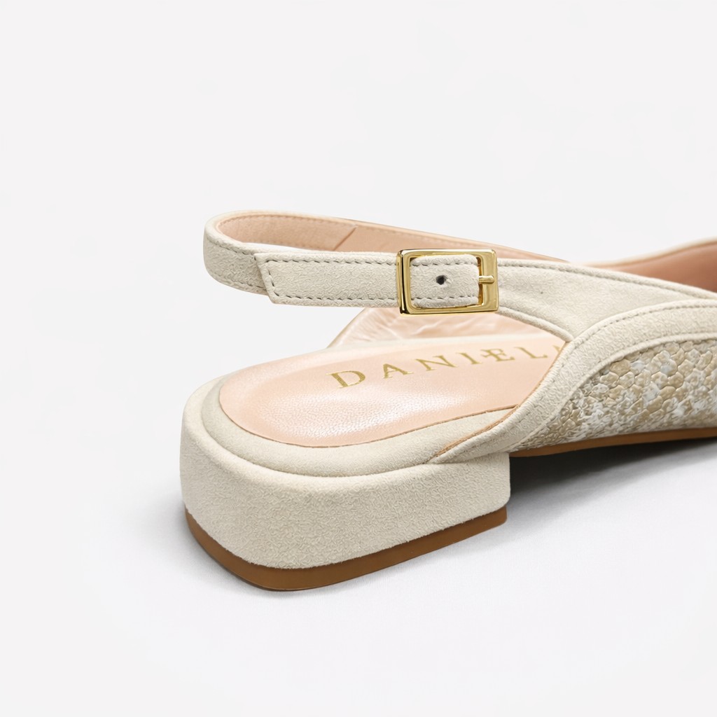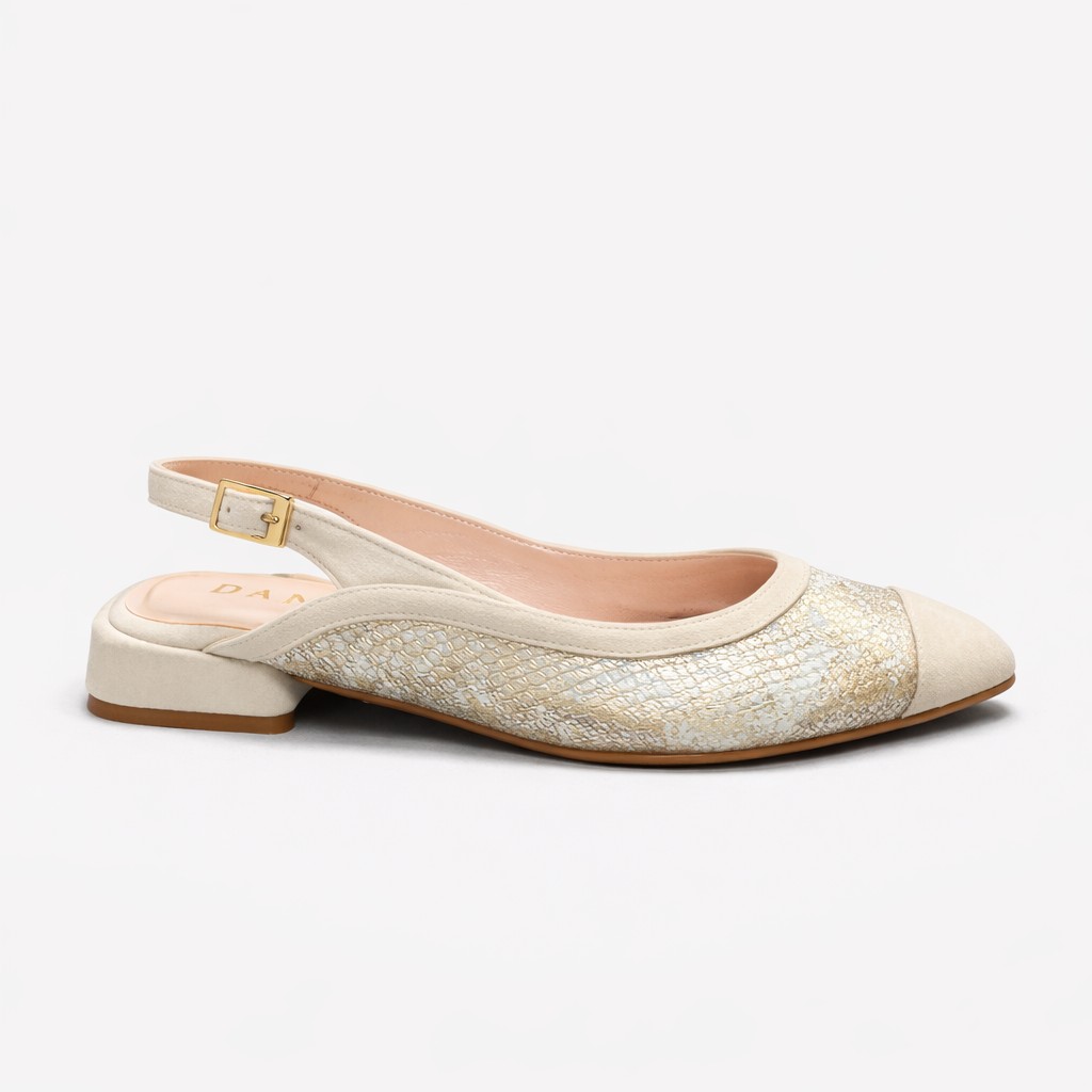 Bailarina destalonada combinada en tonos neutros, ligera y muy versátil. Esta bailarina es el equilibrio perfecto entre comodidad y estilo, ideal para acompañar tus looks de diario o de ocasión. Su diseño en tonos neutros con textura grabada aporta un toque sofisticado y luminoso que combina fácilmente con cualquier outfit.
